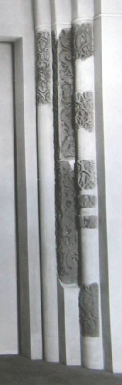 Stipite a cinque ordini con lesene e cordonature alternate scolpite a rilievo.