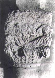 Capitello di colonna, di tipo corinzieggiante. Sopra un grosso arrotondato collarino aggettante, presenta il kalathos cilindrico completamente avvolto da un fitto, rigoglioso dispiegarsi di motivi vegetali.Due sono le corone di foglie d'acanto spinoso; e le spirali dei caulicoli tortili terminano a chiocciola.