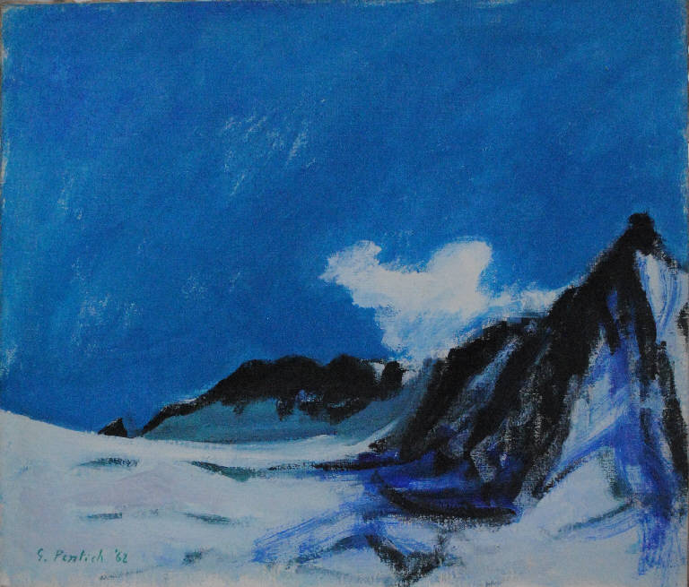 Il soggetto rappresenta alcune cime montuose, che si stagliano sull'azzurro del cielo, e una nuvola bianca che emerge oltre una cima a destra. Probabilmente l'opera fa parte della serie delle "montagne".