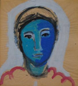 L'autoritratto è dipinto su carta da pacco e si presenta con una cornice dorata. Il volto non presenta colori realistici, come nel caso dell'incarnato di colore azzurro-blu.