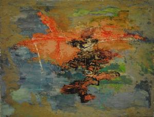 Soggetto materico, in cui prevalgono i colori rosso, marrone, nero e verde.