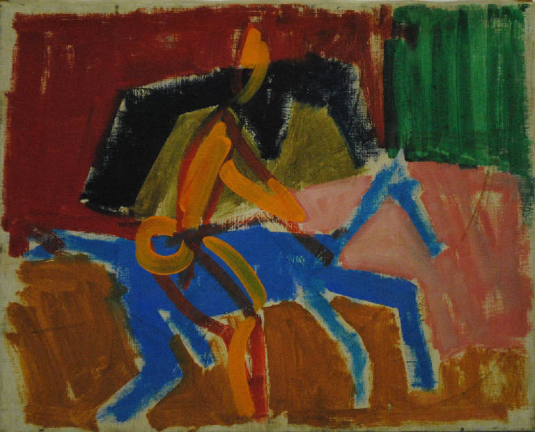 Su un fondo di vari colori, tra cui i prevalenti sono il verde, il rosso e il marrone, si riconosce la figura di un cavaliere su un cavallo azzurro-blu.