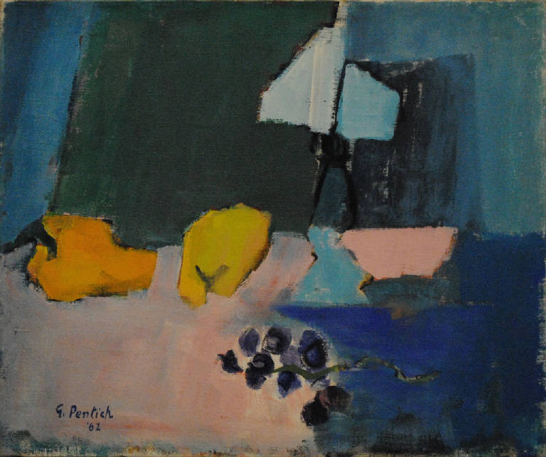 L'opera raffigura una natura morta: su un piano rosa e blu sono disposti un grappolo d'uva, un lume e peperoni gialli.