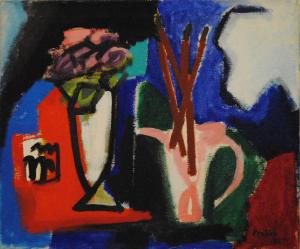 L'opera raffigura una natura morta: su un fondo di diversi colori (nero, blu, rosso, verde e bianco) si riconoscono un vaso di fiori rosa e un vaso contenente quattro pennelli.