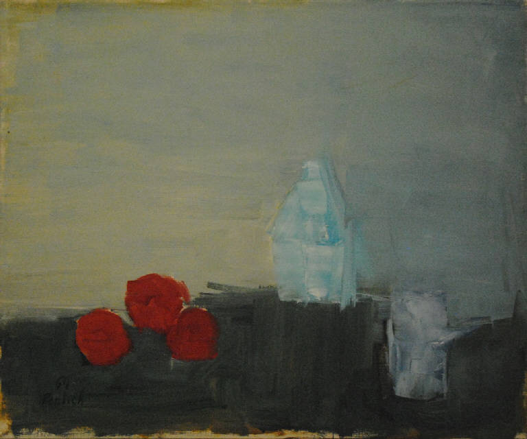L'opera, ispirata alle soluzioni pittoriche di Nicolas De Staël, raffigura una natura morta: su un piano verde scuro si dispongono, sulla sinistra, tre frutti rossi; sulla destra, un vaso azzurro e un oggetto simile a un bicchiere. Colore prevalente del fondo è un azzurro-grigio.