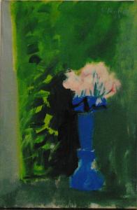 L'opera raffigura una natura morta su fondo verde; in primo piano è presente un vaso blu contenente un mazzo di fiori rosa.