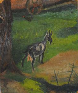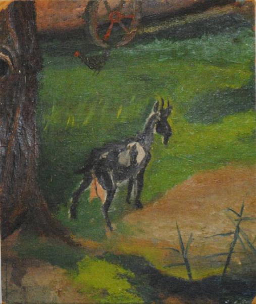 L'opera raffigura uno scorcio agreste: accanto a un albero si trovano una capra e una gallina, mentre in secondo piano si nota la ruota di un carro.