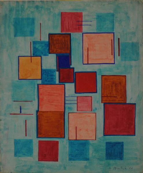 Composizione d'invenzione, di ispirazione mondrianea, artciolata in forme quadrate rosse, arancioni e azzurre, di diversa dimensione, su fondo azzurro.