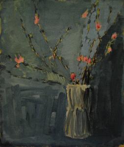 L'opera raffigura un vaso azzurro contenente rami di fiori di pesco su fondo azzurro.