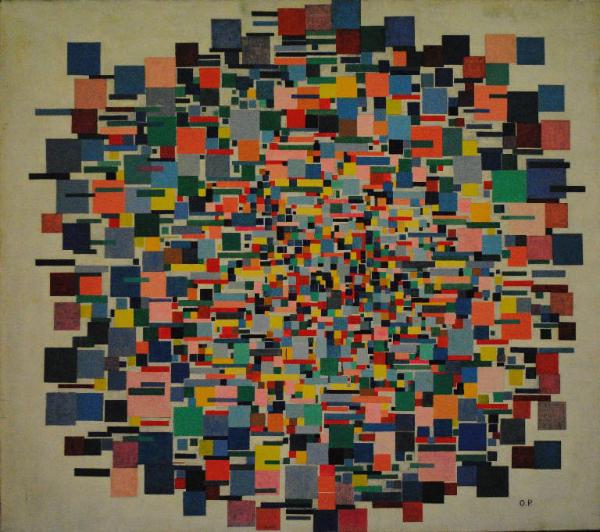 Composizione d'invenzione di ispirazione mondrianea articolata in una serie di piccoli superfici quadrate e rettangolari rosa, blu, gialle e nere su fondo bianco.