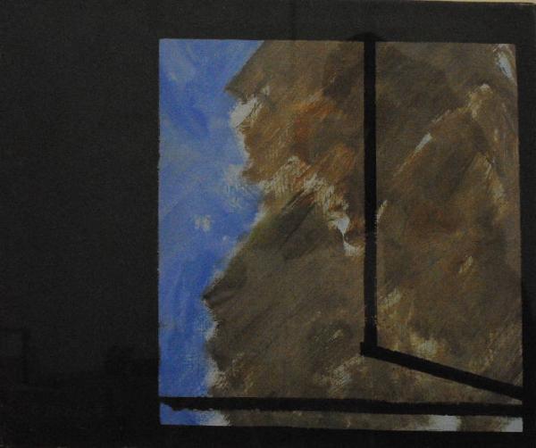 Composizione d'invenzione sulla cui superficie si articola un quadrato, campito con cromie di azzurro e marrone e con inserti di linee spezzate nere che rimandano alla struttura della finestra, su fondo nero. \nL'opera è riconducibile alla sequenza pittorica delle finestre.