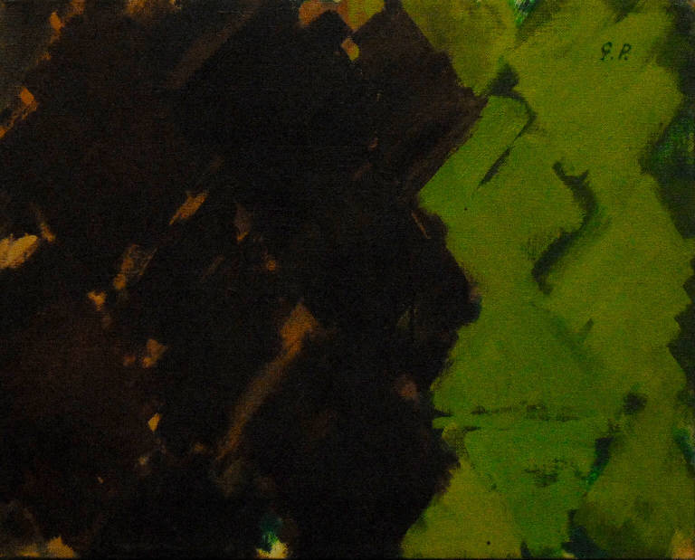 Composizione d'invenzione la cui superficie, articolata in una griglia di figure romboidali, è bipartita cromaticamente per due terzi dai toni del marrone scuro e per un terzo da quelli del verde.