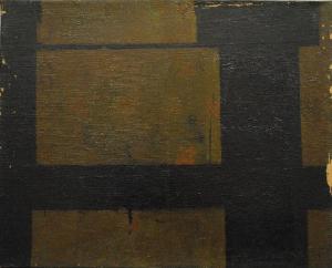 Composizione d'invenzione la cui superficie è ripertita da poche linee nere, orizzontali e verticali, su fondo senape.