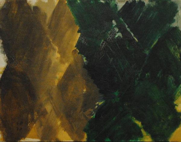 Composizione d'invenzione articolata in figure romboidali e bipartita cromaticamente in beige e verde. L'opera è riconducibile alla sequenza pittorica delle finestre.