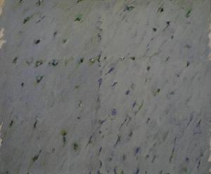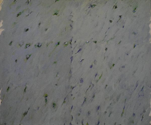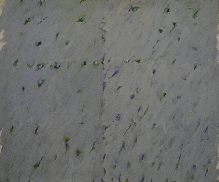 Intorno al perimetro dell'opera è presente un nastro adesivo grigio che funge da rudimentale cornice. Composizione d'invenzione articolata in forme rettangolari appena percettibili campite in maniera gestuale nelle tonalità dell'azzurro.