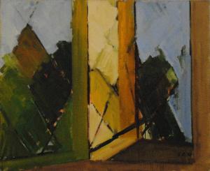 Composizione raffigurante l'elemento architettonico della finestra (vetro, grata); il paesaggio esterno è visibile grazie alla trasparenza del vetro. L'opera appartiene alla sequenza delle finestre.
