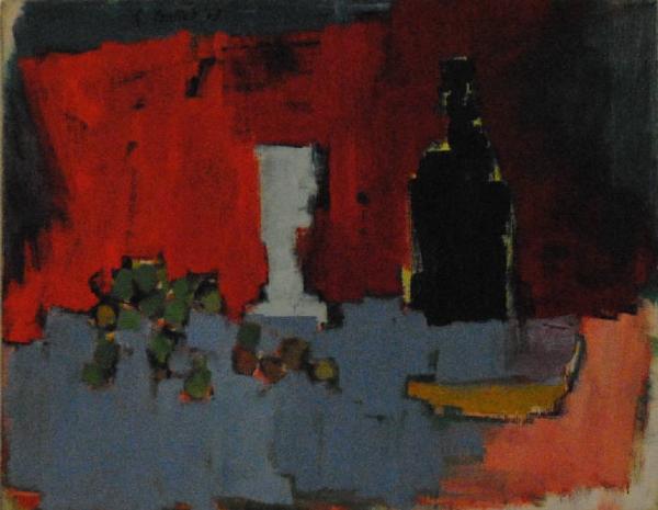 Composizione raffigurante una natura morta, su piano azzurro e fondo rosso, riconducibile alle soluzioni pittoriche di Nicolas De Staël.