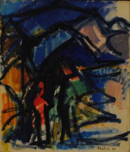 L'opera ha una sottile cornice di legno. Rappresenta in maniera stilizzata un paesaggio montano in cui domina il colore blu, con figure umane in primo piano.
