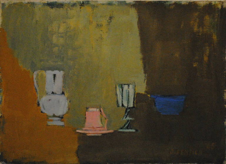 L'opera raffigura una natura morta in cui gli oggetti (una caraffa chiara, una tazzina rosa, un bicchiere, una tazza blu) si stagliano su un fondo tricromatico nei toni del marrone.