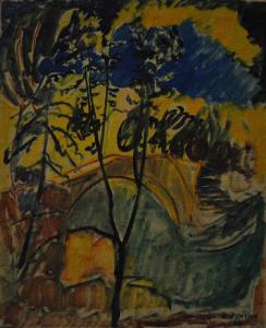 L'opera raffigura in maniera stilizzata uno scorcio di paesaggio in cui dominano i toni del giallo e del blu. In primo piano, davanti ad un ponte che collega le due sponde opposte di un corso d'acqua, si notano i profili degli alberi.
