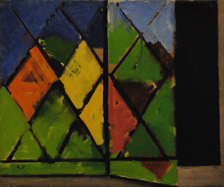 Composizione raffigurante l'elemento architettonico della finestra (vetro, grata); i colori del paesaggio esterno (verde, giallo, rosso e azzurro) sono visibili attraverso la grata e sono riflessi sul vetro. L'opera appartiene alla sequenza delle finestre.