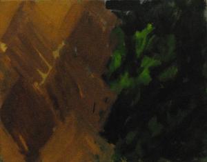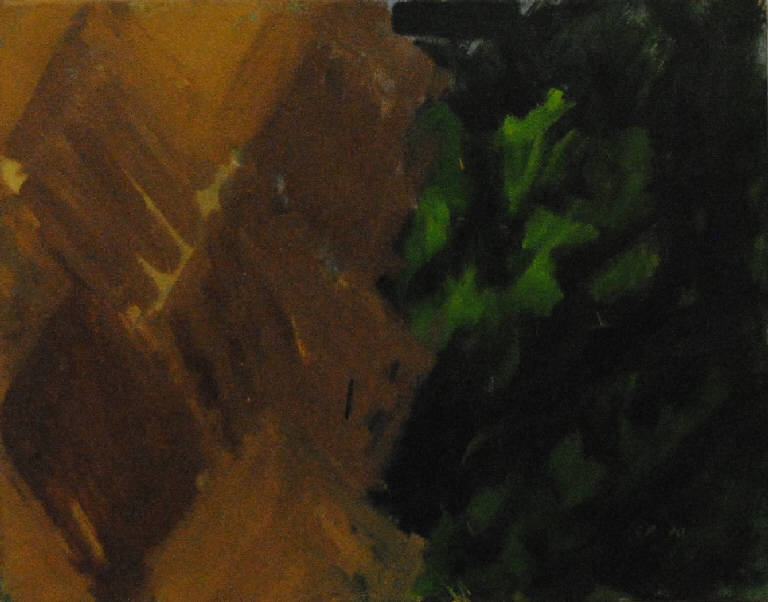 Intorno al perimetro dell'opera è presente un nastro adesivo avana che funge da rudimentale cornice. Composizione d'invenzione bipartita sia in senso cromatico (marrone e verde) sia dal punto di vista della resa pittorica che consta di una parte geometrico-romboidale ed una gestuale. L'opera è riconducibile alla sequenza pittorica delle finestre.