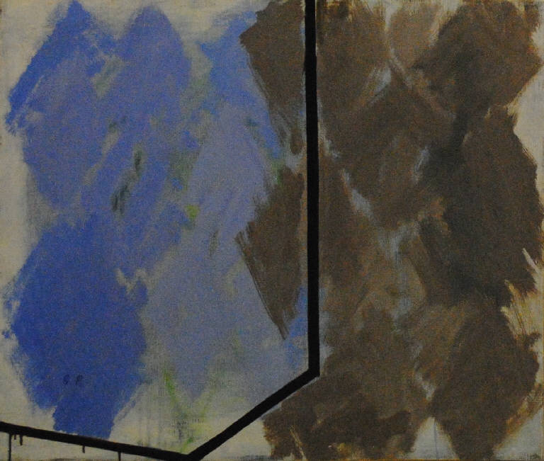 Intorno al perimetro dell'opera è presente un nastro adesivo bianco che funge da rudimentale cornice. Composizione d'invenzione bipartita a livello cromatico (azzurro e marrone) in forme geometriche romboidali e con inserto di una linea spezzata nera, che allude alla sagoma di una struttura parallelepipeda, nella parte sinistra della composizione.