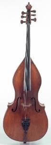 Questo strumento ha una forma inconsueta per una viola da gamba: le punte inferiori sono sporgenti come quelle di un violoncello, le punte superiori sono totalmente assenti; lo strumento assume nella parte superiore una forma simile a quella di una chitarra con le spalle spioventi. I fori armonici sono a forma di effe di violoncello senza le tacche; la testa termina con una chiocciola di forma classica. Il fondo è bombato, in un solo pezzo di acero con due aggiunte laterali nella parte inferiori; le fasce e la testa sono pure in acero. La tavola è in quattro pezzi di abete. I tasselli delle punte sono in abete. Le controfasce del fondo sono in faggio, quelle della tavola sono in acero. La cassa è contornata da un filetto nero in ebano di 1,3 mm. La cordiera è interamente scolpita e termina dal lato di attacco delle corde in un volto umano; non è originale, ma probabilmente ricavata da un violoncello antico. Gli originali quattro fori sono stati chiusi ed al loro posto ne sono stati aperti sei, tanti quante le corde che lo strumento ora monta. La vernice è di color arancio marrone, in buona parte originale sul fondo e sulla tavola (vistoso ritocco di vernice alla paletta inferiore della effe di sinistra). Le fasce presentano molte rotture, alcune aperte, altre già riparate.