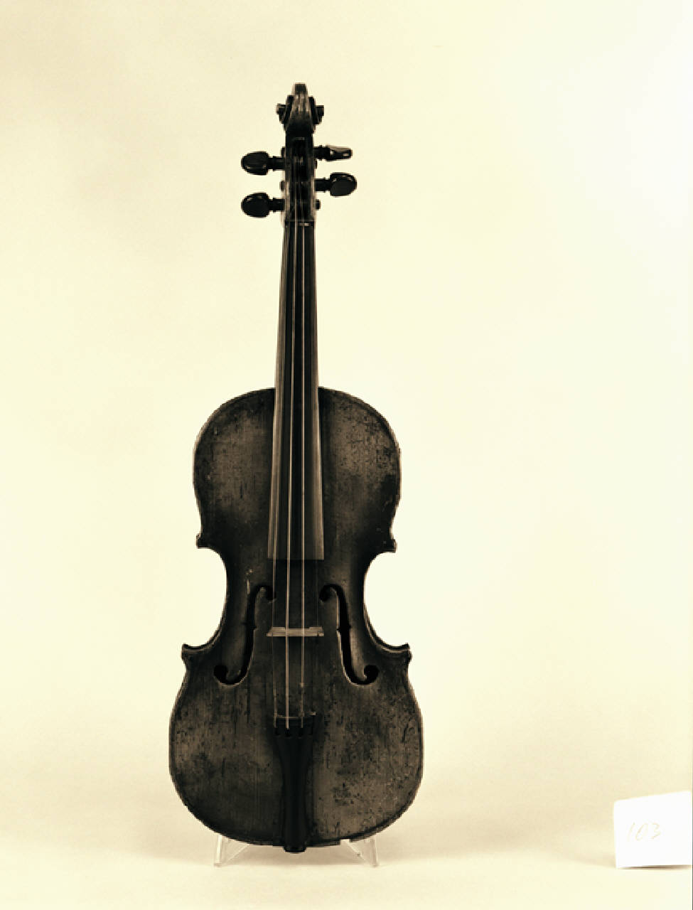 Il fondo è in un solo pezzo di acero con marezzatura profonda ed irregolare. Le fasce sono in acero, marezzate le inferiori, senza marezzatura le altre; l'altezza è alquanto alta in rapporto alla misura del violino. La tavola è in due pezzi di abete con venatura di media larghezza; le tacche dei fori armonici non sono alla metà della effe, ma più spostate in alto. La testa, con manico innestato, è in acero ed ha misure piuttosto da violino 4/4 che da strumento piccolo. Il filetto ha il bianco in acero di mm 0,6 e il nero in acero tinto di mm 0,3. I tasselli delle punte inferiori sono in abete, mentre mancano quelli delle punte superiori; nel tassello superiore è visibile il foro del chiodo che tratteneva il manico. Le controfasce, incastrate nei tasselli delle punte inferiori, sono squadrate e in abete. La vernice, di colore arancio chiaro, è consumata, ma senza alterazioni.