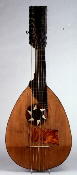La costruzione del guscio è molto accurata ed il costruttore, Gaspare Ferrari, è da considerarsi tra i migliori per i mandolini di area romana della seconda metà del '700. (Dello stesso autore in questa collezione vi è anche un mandolino . 210). Lo strumento è molto simile ad un altro della collezione catalogato con 239 ed è costruito dal medesimo liutaio. E' da considerare un basso di mandolino a dieci ordini, di cui i primi sei sono doppi e tastabili, mentre i rimanenti quattro sono di bordone. La tavola armonica è in due pezzi uniti in maniera speculare, con una venatura che si assottiglia nel punto di massima larghezza. Il ponticello non risulta essere originale e la buca è decorata con sei particolari alternati in osso e palissandro che formano un cerchio; vi è inoltre la presenza di una graffiatura circolare. Il battipenna, a forma di parallelogramma, è, con buona probabilità, in tartaruga (data la doratura sottostante) ed è ulteriormente bordato con una filettatura. L'intero profilo della tavola armonica è contornato da un filetto scuro. Il guscio è composto da diciannove doghe in noce (?), di cui le due estreme, cioè quelle che si attaccano alla tavola armonica, sono larghe più del doppio delle altre. Le doghe sono intercalate da filetti giallognoli (bosso ?).