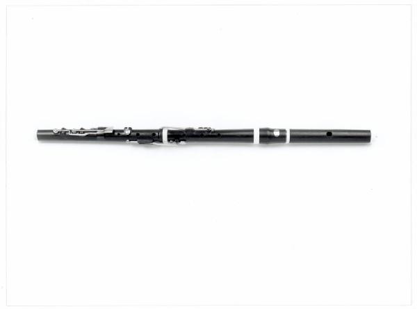 strumento con ghiere metalliche e 9 chiavi in lega d'argento imperniate su risalti del legno (Si, Do, Do# aperte; Mib, Fa, Fa lungo, Sol#, Do, Mi). I fori d'estensione sono incamiciati. Vistosa fenditura (riparata) nella testata e nel barilotto, il che non impedisce allo strumento di suonare ancora, anche se non in modo perfetto.