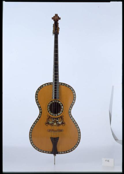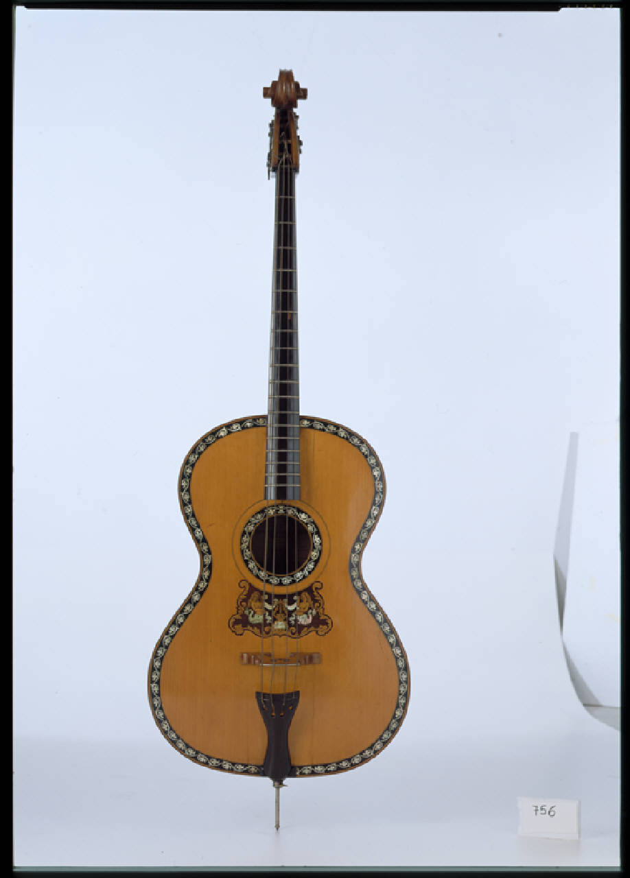 Questo strumento, noto come "arcichitarra" nasce nel laboratorio della ditta Monzino. Ampiamente publicizzato nei cataloghi veniva proposto alle società mandolinistiche e chitarristiche come bassetto. In qualche catalogo viene menzionato anche con il nome di "chitarrone moderno". Costruito da Severino Riva, lo strumento ha un'etichetta della ditta Monzino che precisa "fatto dal proprio lavorante Severino Riva", con in calce la firma di Antonio Monzino. Lo strumento è costruito con grande cura. Il piano é in legno di conifera, forse cedro, a venatura irregolare con anelli annuali marcati. Il contorno del piano e dei fori armonici é intarsiato con tessere di madreperla a motivi vegetali annegate nello stucco nero e bordate con un filetto. Lo stesso motivo si ritrova attorno alla buca. Sotto la buca un altro grande intarsio con due sirene in acero, palissandro e madreperla che reggono il cartiglio "Ricordo Milano", questo motivo ricorre anche nello strumento inv. n. 759.