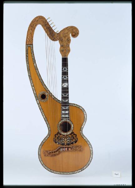 Chitarra con sei bordoni del tipo definito nei cataloghi Monzino "Chitarra Arpa". Opera di Severino Riva, uno dei migliori lavoranti della ditta Monzino. Benché scomodo da suonare e sbilanciato nel peso, questo tipo di chitarre, di lontana derivazione neoclassica, ebbe successo per il volume di suono dovuto alla cassa più grande; proprio per il loro maggior volume venivano reclamizzate nei cataloghi Monzino. Sul fondo, in corrispondenza dei due fori armonici, sono incollate due etichette della ditta Monzino che precisano "fatto dal proprio lavorante Severino Riva", con in calce la firma di Antonio Monzino. Lo strumento è costruito con grande cura. Il piano é in conifera, forse cedro, a venatura irregolare con anelli annuali marcati. Il contorno del piano e dei fori armonici é intarsiato con tessere di madreperla a motivi vegetali annegate nello stucco nero e bordate con un filetto a cinque strati alternati nero/giallo/nero di acero e acero tinto.