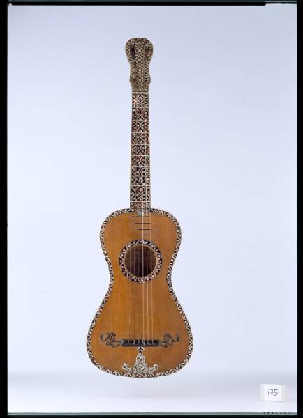 Chitarra di tipo ottocentesco a sei corde con cassa che per forma e proporzioni ricorda i modelli napoletani dell'inizio del XIX secolo; anche paletta e decorazioni sono simili ad alcuni modelli di Fabricatore, Filano e Vinaccia. Questa chitarra, pur avendo un'etichetta Monzino, lascia molti dubbi circa il suo vero autore, anche perché le sue caratteristiche corrispondono a quelle di un modello leggermente più antico. di quanto lascia intendere l'etichetta.Lo strumento è riccamente intarsiato e decorato e ha subito più di un restauro. Etichetta a stampa "Antonio Monzino / Fabbrica / Istrumenti musicali e corde armoniche d'ogni qualità / in/ Milano / nella contrada della Sirena n. 4.37 / All'insegna della Sirena / con magazzeno / di ordigni inglesi per qualsiasi genere di pesca / 1850". La data è aggiunta a penna in piccolo alla base dell'etichetta.La tavola è in abete in due pezzi a venatura fine non speculari ed è stata verniciata posteriormente. Il bordo e la buca sono decorati.