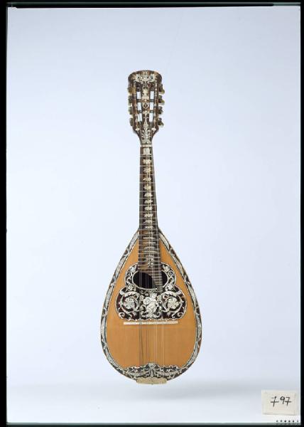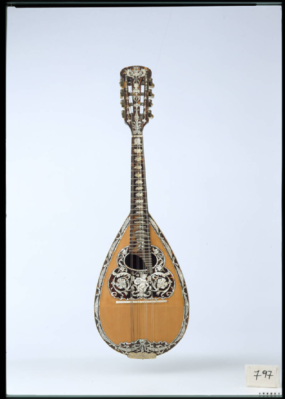 Mandolino napoletano realizzato con grande cura e ricchezza di decorazioni. Si tratta di uno di quegli strumenti definiti "capi d'opera" dove l'artigiano mostrava tutta la propria abilità. All'interno etichetta generica a stampa:"A.Monzino/fabbricatore e negoziante strumenti musicali a corde/corde armoniche/Milano/Via Rastrelli 10"La tavola è in abete in due pezzi speculari a venatura fine, il bordo è decorato con un intarsio a festoni di tartaruga, madreperla, celluloide e galalite. Il grande battipenna centrale, che comprende anche la buca ovale, è realizzato con la stessa tecnica e materiali e raffigura un putto musicante circondato da motivi vegetali. Il ponte è in galalite. La cassa e la controfascia esterna sono interamente rivestiti in tartaruga con intarsi allegorici in madreperla e celluloide che raffigurano tre putti musicanti circondati da tralci, intrecci e motivi zoomorfi. Il guscio internamente é foderato in abete. Il manico e la paletta sono interamente rivestiti in tartaruga.