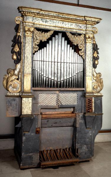 Lo strumento è racchiuso da una cassa lignea in pioppo dal disegno sontuoso, verniciata ed arricchita di decorazioni dipinte e lavori a traforo. \nIl prospetto, distribuito in una sola campata ad unica cuspide, è costituito da 23 canne in stagno, presenta profilo piatto e bocche con andamento contrario alla cuspide, i labbri superiori sono sagomati a mitria. Tutta la mostra appartiene al registro Principale bassi. La meccanica è del tipo sospesa, con catenacci in ferro forgiato e legati con strangoli in ottone. Il compendio del manuale è rivolto verso l¿esterno. La prima ottava del manuale è collegata al somiere del pedale, tuttavia la meccanica pare più recente dello strumento. \nLa tastiera conta 47 tasti con estensione DO1-RE5 e prima ottava scavezza. I tasti diatonici sono coperti in osso con fronte rivestito in ebano e fresato, quelli cromatici sono realizzati in ebano con filetti bianchi. Lo Stichmass è di 483 millimetri. La pedaliera, a leggìo ma di fattura recente, conta 17 pedali con ambito Do1-Sol#2, collegata al somiere con un compendio di fattura recente, presenta seconda ottava ritornellante sulla prima, unione fissa e trascinamento reale. \nIl somiere del pedale era posto sul fondo entro un prolungamento della cassa.