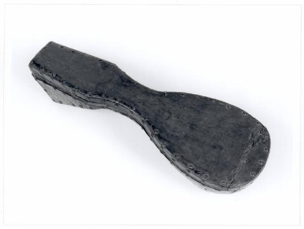 E¿ una custodia per mandolino e può essere fatta risalire alla seconda metà del ` 700. E¿ in legno e su di essa è stato sagomato del cuoio, successivamente fissato, lungo tutto il perimetro, con delle borchie metalliche. Il coperchio è incernierato a metà circa della cassa e sulla parte superiore è presente una serratura in metallo (ferro ?). La parte interna è foderata con stoffa di colore marrone-rossastro ma questa potrebbe essere di un periodo successivo. Date le dimensioni e la sagoma si suppone che sia la custodia per il mandolino milanese costruito da Francesco Presbler nel 1769 di questa collezione inventariato con il numero 253.