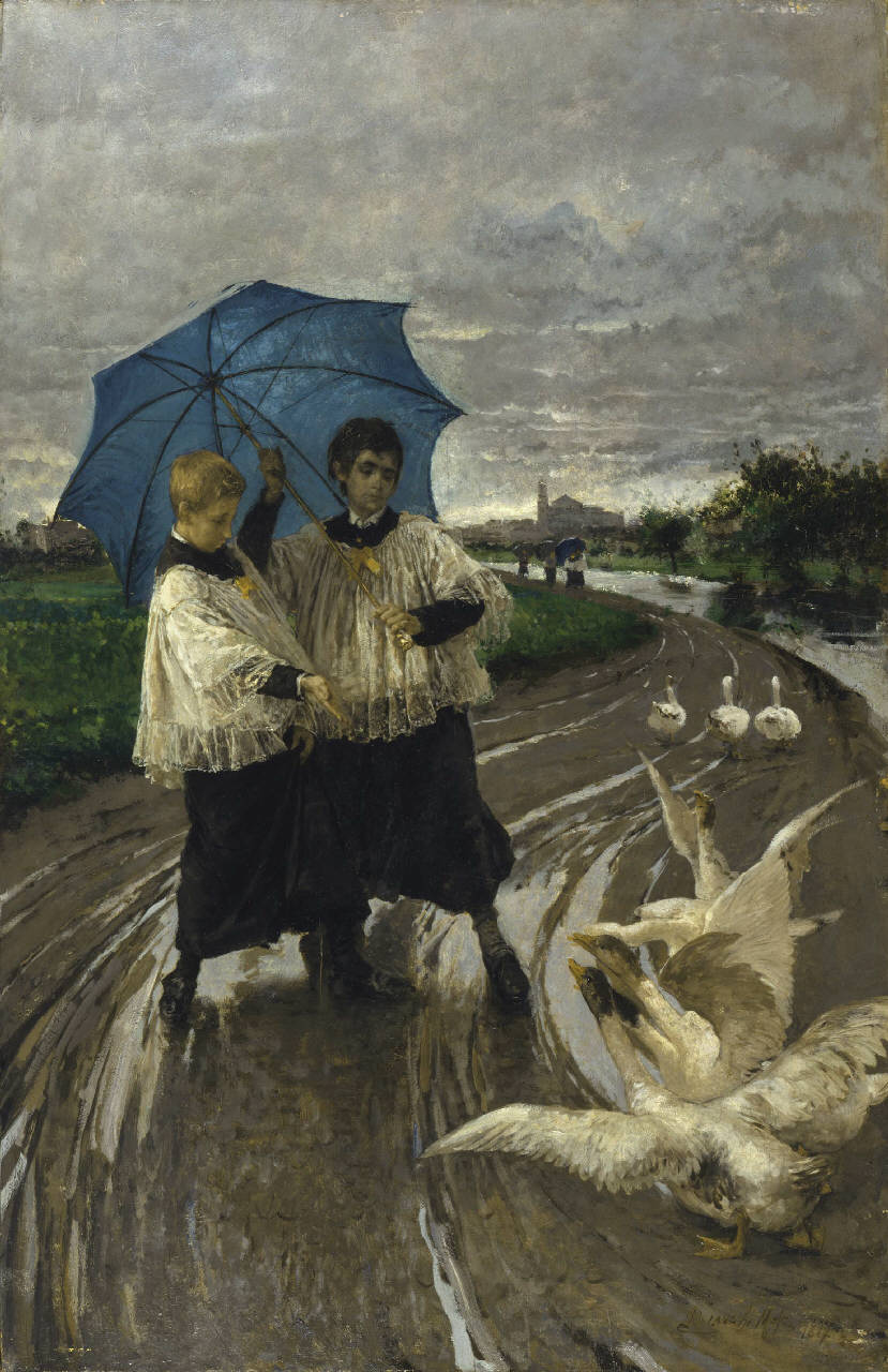 Il ritorno dalla sagra. figure di giovani chierici con oche