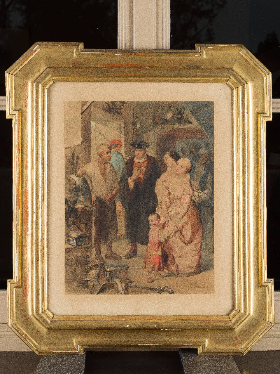 Bottega d'armaiolo a Milano. interno di bottega con figure