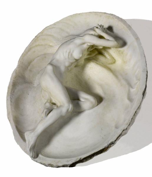 Entro un ovale si staglia un nudo femminile di profilo che si porta le mani alla testa; la donna è semisdraiata con le ginocchia sollevate.