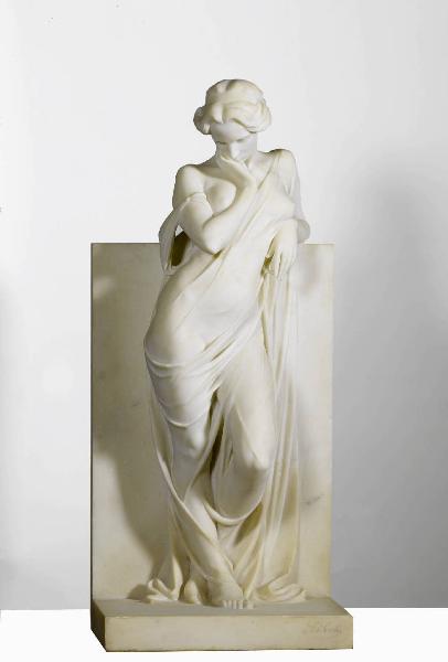 Figura femminile stante col braccio sinistro appoggiato ad una lastra alle sue spalle. La donna si porta la mano destra al viso chinato in avanti. Indossa una veste lunga e aderente al corpo che le lascia scoperte le braccia.