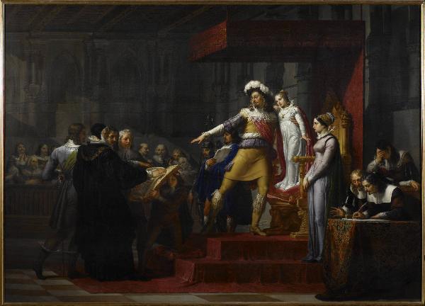 Gustavo Adolfo re di Svezia prima di partire per la guerra di religione riceve dall'assemblea degli stati generali giuramento di fedeltà alla propria figlia Cristina. gustavo adolfo re di svezia