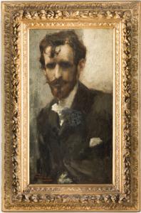 Ritratto di Luigi Arrigoni. uomo in abito scuro, con baffi e capelli neri, luigi arrigoni, pittore