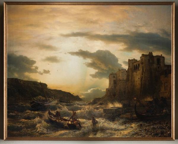 - NOTIZIE STORICO CRITICHE Il dipinto, datato e firmato dall'artista, fa parte della serie di quadri in cui Achenbach si sofferma sull'osservazione e descrizione degli effetti di fenomeni metereologici nel paesaggio marino, con una particolare predilezione per le i momenti profondamente sconvolgenti e drammatici come le tempeste. Esse non sono però mai colte in fieri, ma l'artista preferisce mostrarci i segni del loro arrivo o le tracce del loro violento passaggio. Il dipinto è giunto nella Raccolta con un deposito da parte della Pinacoteca di Brera, che, a sua volta lo aveva acquistato nel 1857 dall'artista stesso.