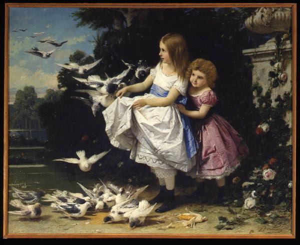 - NOTIZIE STORICO CRITICHE Il dipinto, firmato in basso a destra, è stato esposto a Brera nel 1869 come dipinto di genere sotto il titolo "Ritratto di due fanciullette". L'opera, nota anche con il titolo "Colombi (ritratti di bambine)", ritrae le due figlie del cavaliere Ulisse Borzino. \nLa tela è entrata a far parte delle Raccolte nel 1939 attraverso il dono della Fondazione Durini che ne era divenuta proprietaria probabilmente per acquisizione diretta dallo stesso Borzino (che ne risulta proprietario almeno fino al 1899).