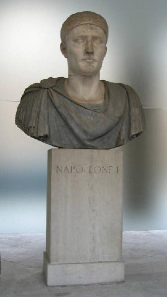 - NOTIZIE STORICO CRITICHE Della firma e data incise sul busto di cui si parla già nel catalogo delle sculture di Giorgio Nicodemi e A. Bezzola del 1938 non si è trovato traccia, quindi, l'autografia del Comolli per questo busto monumentale non è confermata, anche se è sempre possibile che la firma sià sfuggita al rilevamento diretto per alcune difficoltà oggettive avute nel visionare la scultura nella sua totalità. Si tratta sicuramente di uno scambio di dati con l'altro busto di Napoleone conservato al Museo del Risorgimento, questa scultura riporta effettivamente l'iscrizione che viene erroneamente attribuita al busto qui schedato (cfr. n. inv. 3877)