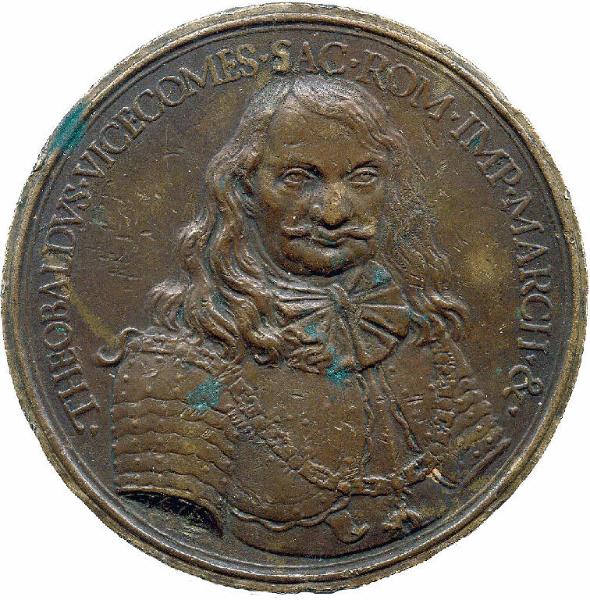 Entro una doppia cornicetta posta in corrispondenza della circonferenza, la medaglia raffigura sul recto il ritratto a mezzo busto frontale del marchese Teobaldo Visconti. L'uomo è abbigliato secondo la foggia vestimentaria maschile tipica della seconda metà del Seicento, che prescrive l'armatura, dalla quale fuoriesce la cravatta a forma di fiocco all'altezza del collo, e i capelli lunghi che ricadono sulle spalle, accompagnati da baffi tagliati all'ungherese. Sull'armatura l'uomo indossa il Collare dell'Ordine del Toson d'Oro disposto da spalla a spalla. Sul verso, inserito nella medesima doppia cornicetta, è raffigurato al centro un leone rampante con il corpo rivolto a sinistra, il muso frontale e le zampe posteriori appoggiate su un terreno sassoso su cui striscia una vipera in fuga verso sinistra. Sia il recto che il verso riportano un'iscrizione che segue il profilo circolare: "THEOBALDVUS-VICECOMES-SAC-ROM-IMP-MARCH-&-" (recto) e "VIS-NON-VIRUS" (verso). Nel taglio del braccio destro dell'uomo compare la data "1675" da identificare con l'anno di realizzazione della medaglia.