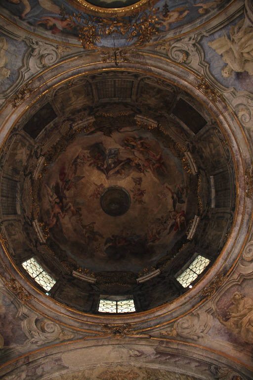 - NOTIZIE STORICO CRITICHE La decorazione della cupola della cappella dell'immacolata Concezione vede all'opera il pittore Giovanni Battista Sassi che si occupa del disegno d'insieme e delle figure, il quadraturista Eugenio Ricci che realizza le prospettive architettonica e un anonimo decoratore che completa l'insieme con cornici, tralci di foglie e frutta in stucco modellato e dipinto. La storiografia antica ricorda anche l'intervento di Giovanni Antonio Cucchi di cui però i critici contemporanei non riescono ad individuare la mano. L'insieme, la cui esecuzione è documentata dalla letteratura artistica contemporanea a partire dal 1737, costituisce la summa pittorica e iconografica dell'opera di rinnovamento della cappella avviata sul finire degli anni Trenta del Settecento. All'interno di eleganti partiture architettoniche basate su diverse tonalità di grigi si dispongono "figure mariane": nei pennacchi ci sono Mosè e Davide che scrivono testi carichi di annunci profetici riguardanti la Vergine, l'evangelista Luca che ne fa il ritratto e Giovanni che nell'Apocalisse ne prefigura il trionfo. Nella volta è illustrato il dogma del l'Immacolata Concezione attraverso un complesso sistema di rimandi alle sacre scritture. Stilisticamente, la letteratura critica considera questo dipinto murale come una delle opere più riuscite del Sassi in cui la luce, memore di suggestioni del Correggio, crea un insieme unitario nel quale si muovono figure dal modellato morbido ed elegante.