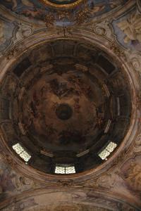Eleganti partiture architettoniche realizzate a monocromo definiscono i profili dei pennacchi della volta e creano cornici mistilinee entro le quali siedono Mosè, Davide, S. Luca e S. Giovanni Evangelisti su fondo azzurro. Le quattro figure introducono al complesso decorativo della volta che illustra il dogma dell'Immacolata Concezione: nelle nuvole disposte in cerchi a seguire il profilo architettonico della volta, sono inserite la creazione di Adamo ed Eva, la Madonna con Dio Padre e, ai suoi piedi, il male in forma di drago sul quale si lanciano angeli armati di lancia. Sopra tutti, nello spazio della lanterna, c'è la colomba dello Spirito Santo irraggiante la luce calda che pervade l'intera scena ed accarezza morbidamente i personaggi delle scene sacre, i dettagli decorativi e gli angeli che volano nel cielo e fra le nuvole mostrandosi in pose virtuosistiche e scorciate da sotto in su.