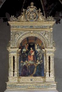 - NOTIZIE STORICO CRITICHE La maestosa ancona viene commissionata per fare da cornice alla pala dell'altare maggiore. Entrambe le opere si inseriscono nel piano di rinnovamento della chiesa e dell'annesso convento promosso da padre Francesco Sanson, divenuto generale dell'ordine francescano nel 1475. Bresciano di origine, il Sanson si adoperò per arricchire di opere d'arte di primaria importanza il convento della sua città natale. Stando all'iscrizione contenuta nel tondo che si trova al centro del basamento l'ancona era già completata nel 1502 (F. FRANCISCUS/ SANSON DE BRIX./ M.M. GENERALIS/ AERE SVO/ MDII). Sebbene la scritta sia una integrazione ottocentesca fatta probabilmente in occasione del restauro ricordato nel tondo al centro dell'architrave (A./ MDCCCXXI/ TEMPLI CURATORES/ IN MELIUS/ RESTITV[ERUNT]) , si può ipotizzare con una certa sicurezza che riproponga l'originale rinascimentale senza grandi variazioni. L'ancona è attribuita allo scultore bresciano Stefano Lamberti sulla base di un confronto stilistico stringente con una analoga opera realizzata per la chiesa di San Giovanni Evangelista, la cui autografia è documentata dal contratto di allogazione. Le grandi "macchine d'altare" dello scultore sono caratterizzate dalla loro fisonomia tridimensionale, sono delle vere e proprie architetture lignee strettamente legate, sia negli elementi strutturali sia in quelli decorativi, ai grandi cantieri rinascimentali della città come la chiesa di Santa Maria dei Miracoli o il primo ordine del Palazzo del Loggia.